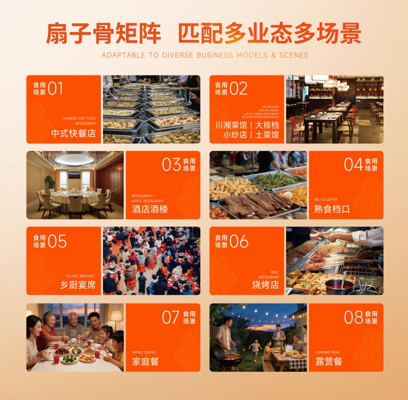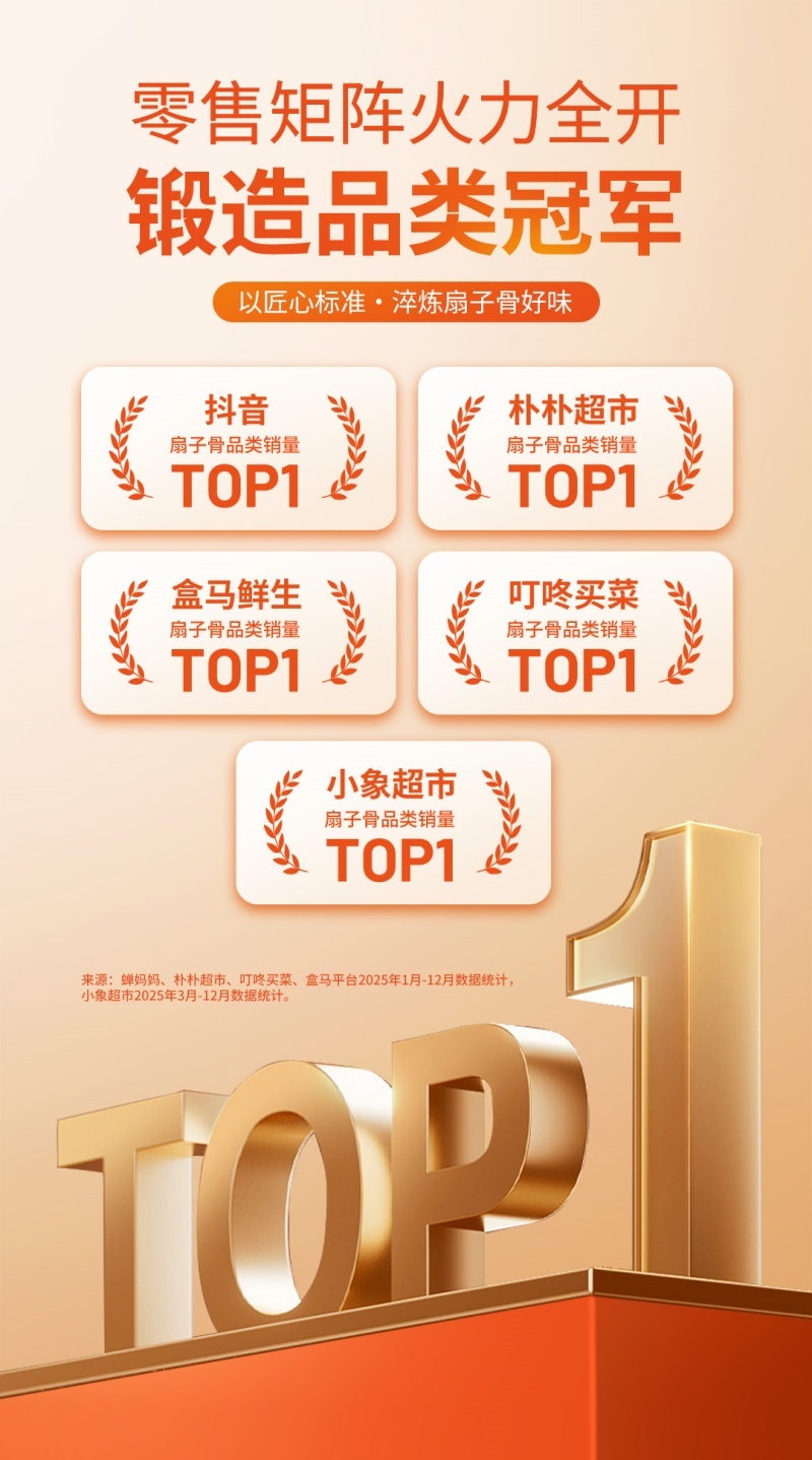 依托强大的研发实力,如意三宝在单一爆款的基础上,逐步构建起覆盖多场景需求的产品矩阵,实现B端与C端市场的双火爆。在B端市场,针对乡厨宴席、酒店餐饮、快炒店、烧烤夜宵等不同业态的核心需求,精准推出手抓扇子骨、孜然扇子骨、蒜香扇子骨、快炒扇子骨等多款产品,凭借标准化品质与高效出餐特性,成为上万家终端餐饮的优选食材;在C端市场,聚焦都市白领、宝爸宝妈等群体的烹饪需求,推出清洁标签的孜然扇子骨、高性价比的蒜香扇子骨等产品,适配空气炸锅、平底锅等多种家用厨具,免洗免切的特性大幅降低烹饪门槛,同时以老少咸宜的风味在银发群体中收获广泛好评。